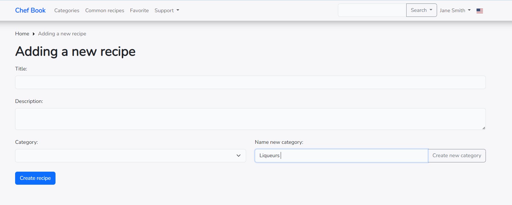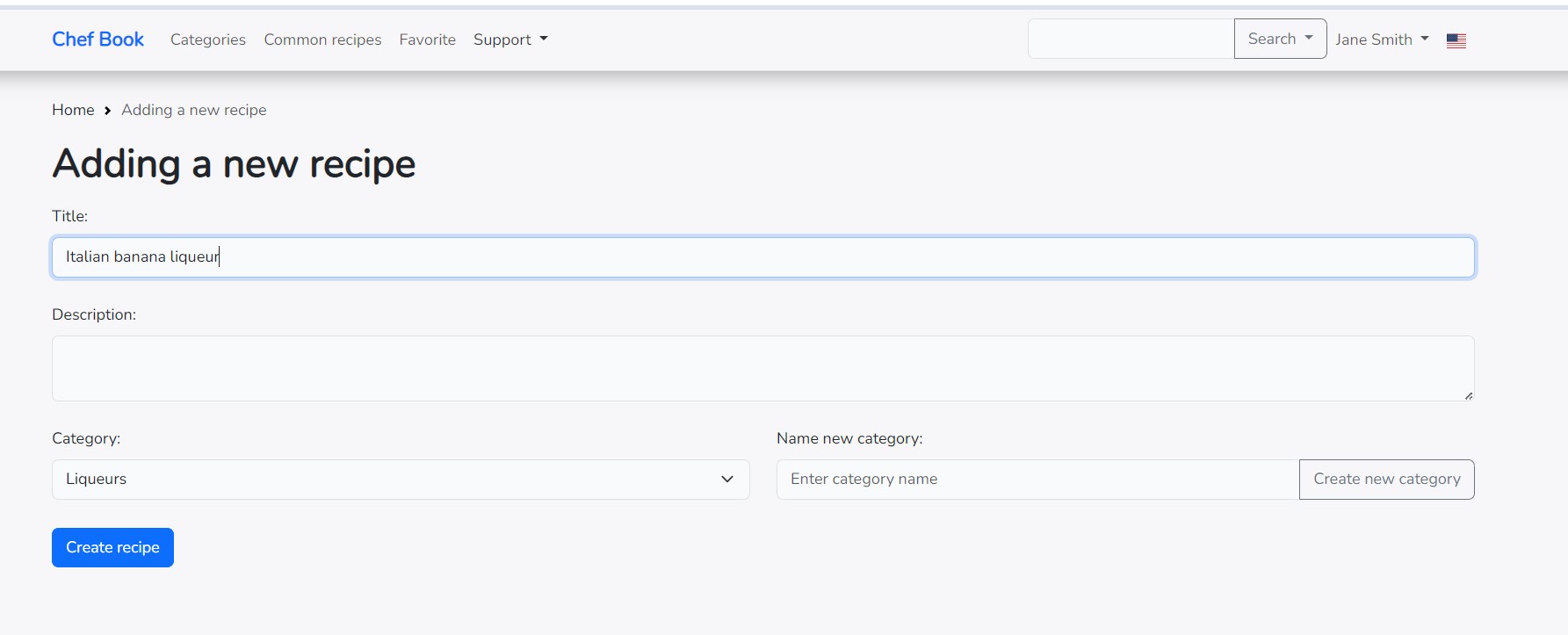 After creating a new category or selecting an existing one, enter the name of the recipe in the provided field. If necessary, add a description and click the "Create Recipe" button.