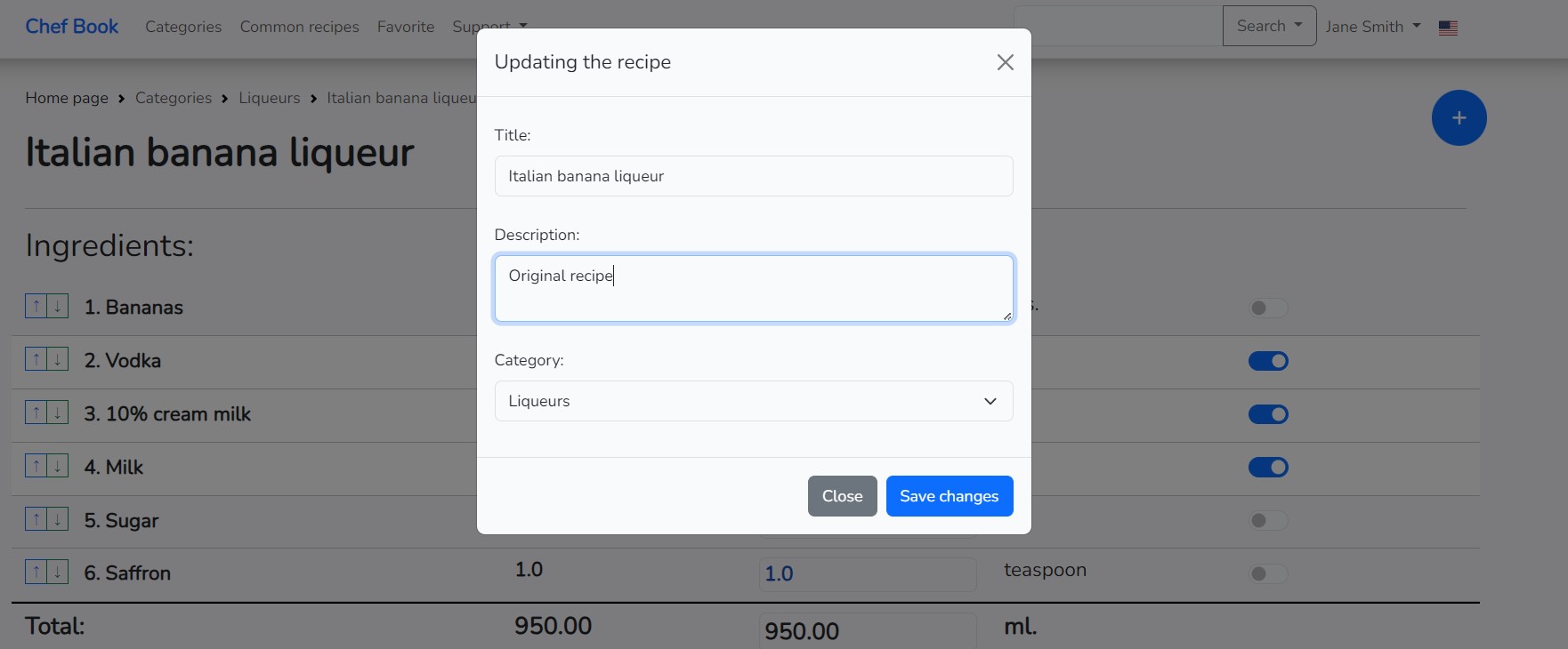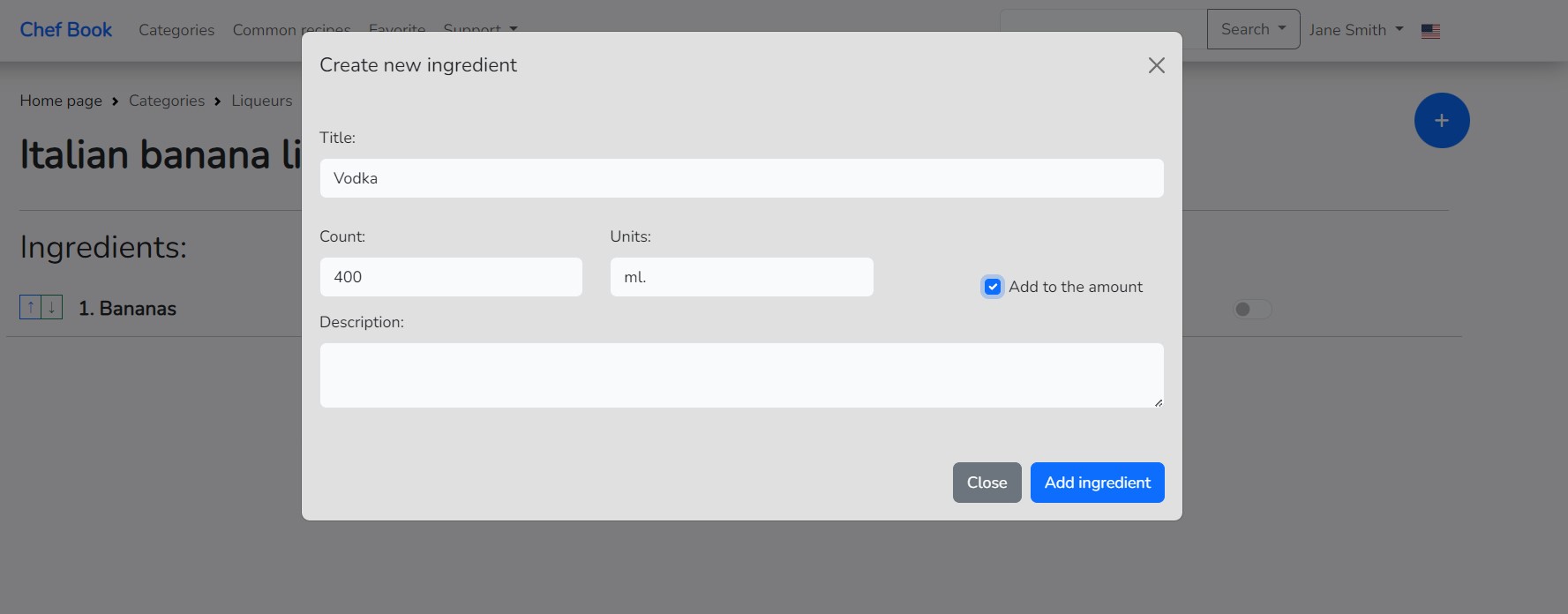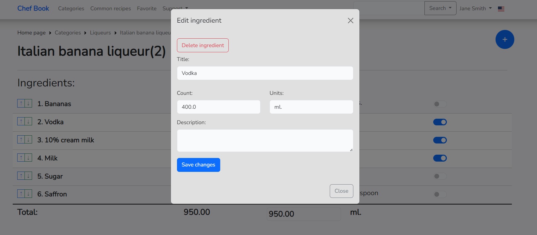 When clicking on the name of the ingredient, a dialog window for editing the properties of the ingredient opens, such as "Title", "Count", and "Units" of measurement, as well as "Description". Also, in this window, there is a button for deleting the ingredient, clicking on which you can remove the ingredient from the recipe.