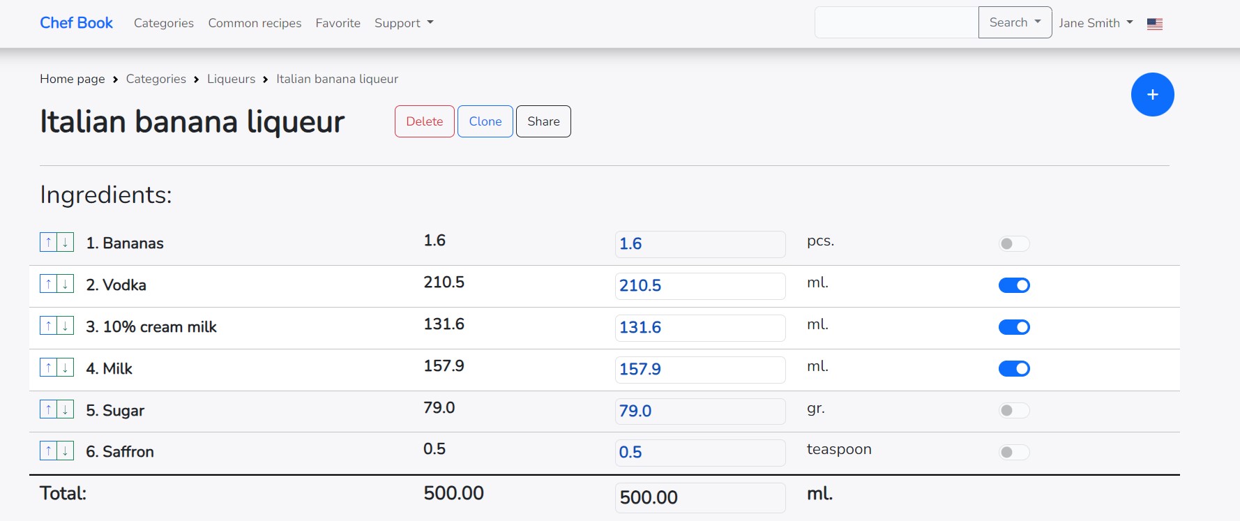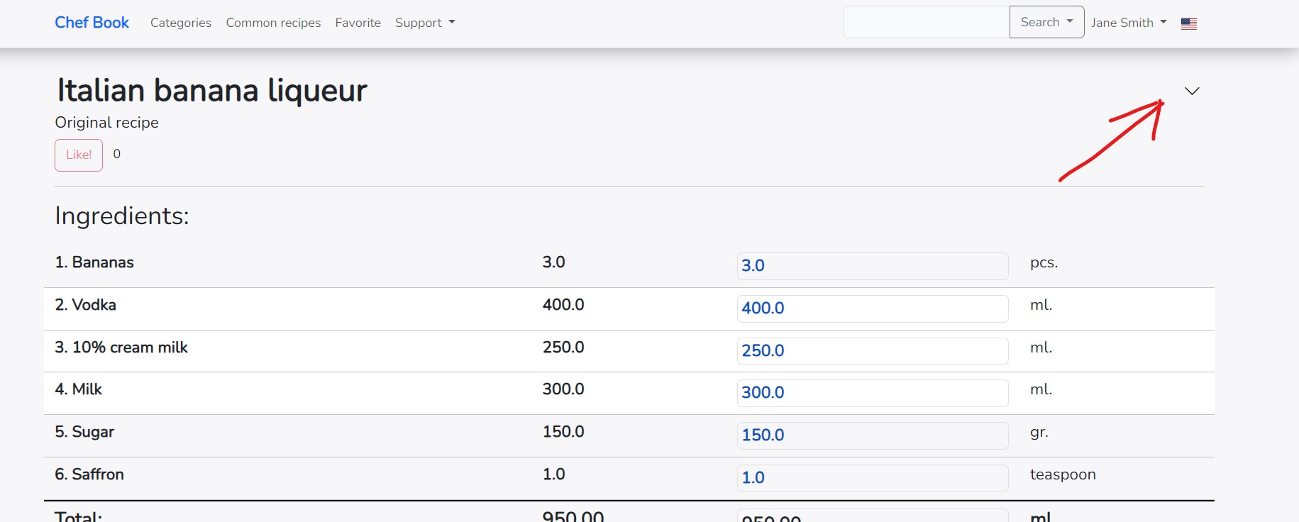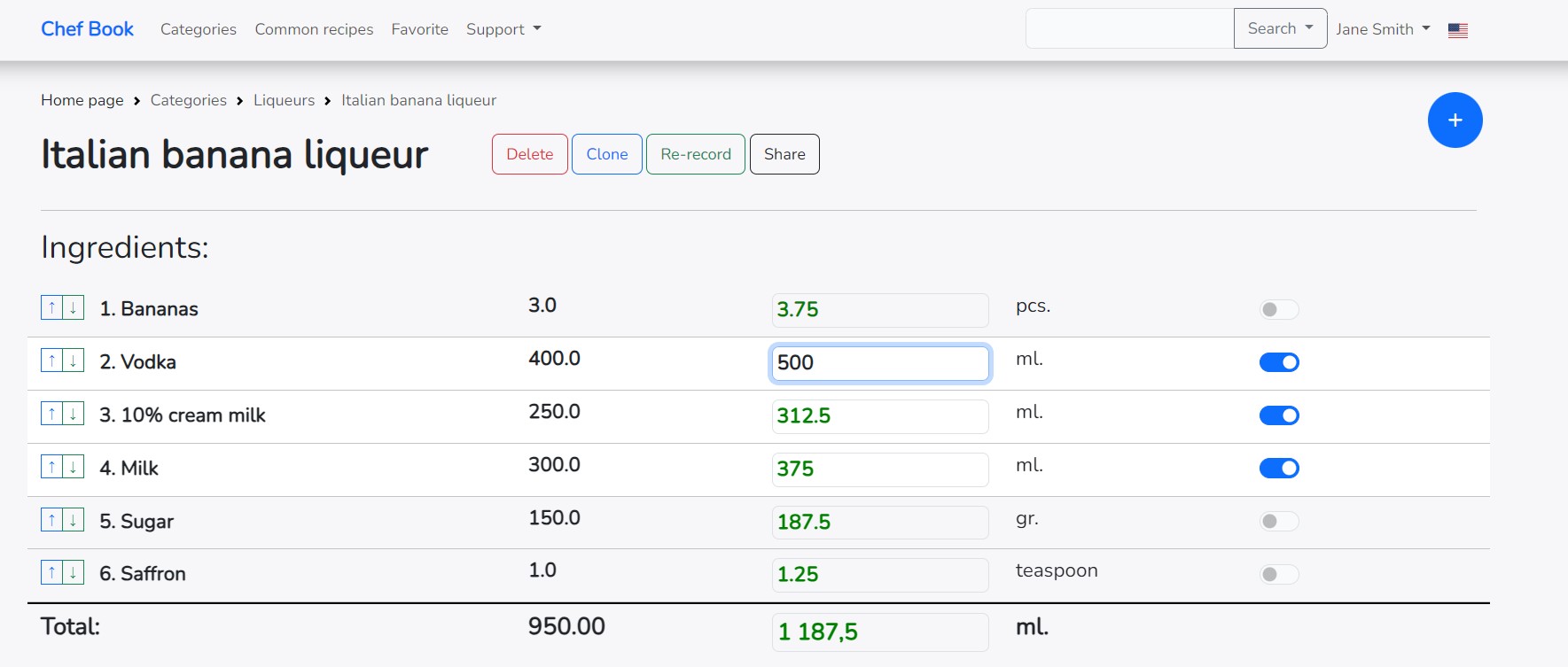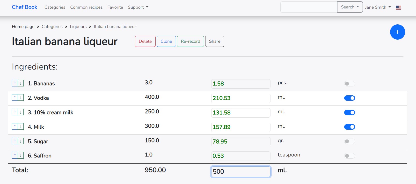If you change the final amount of the recipe in the right column, all ingredients will also be recalculated for the entire recipe.
