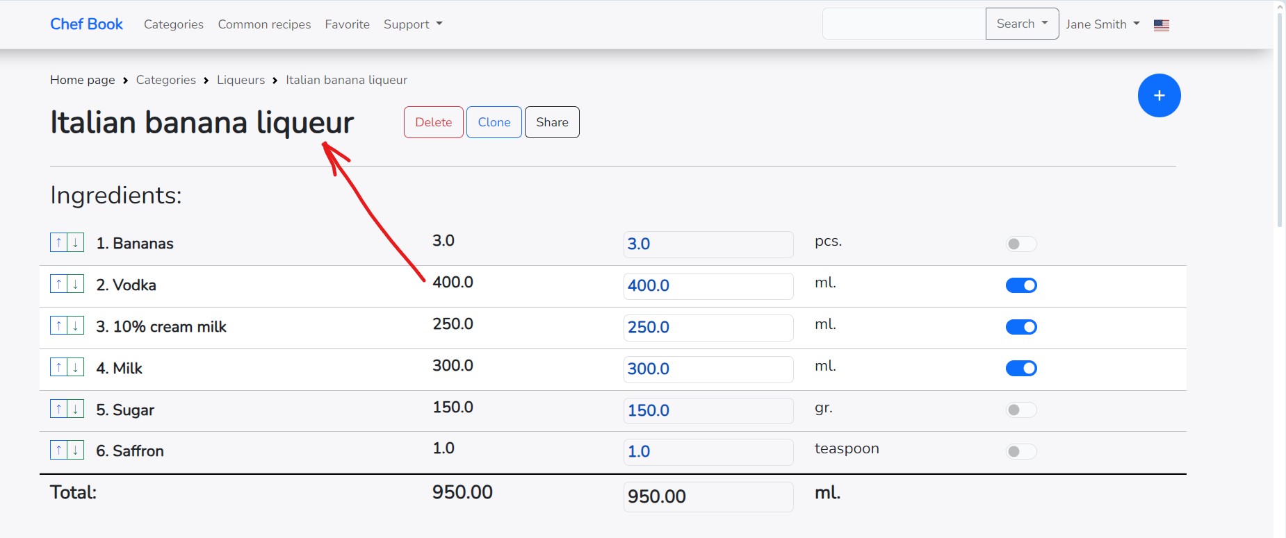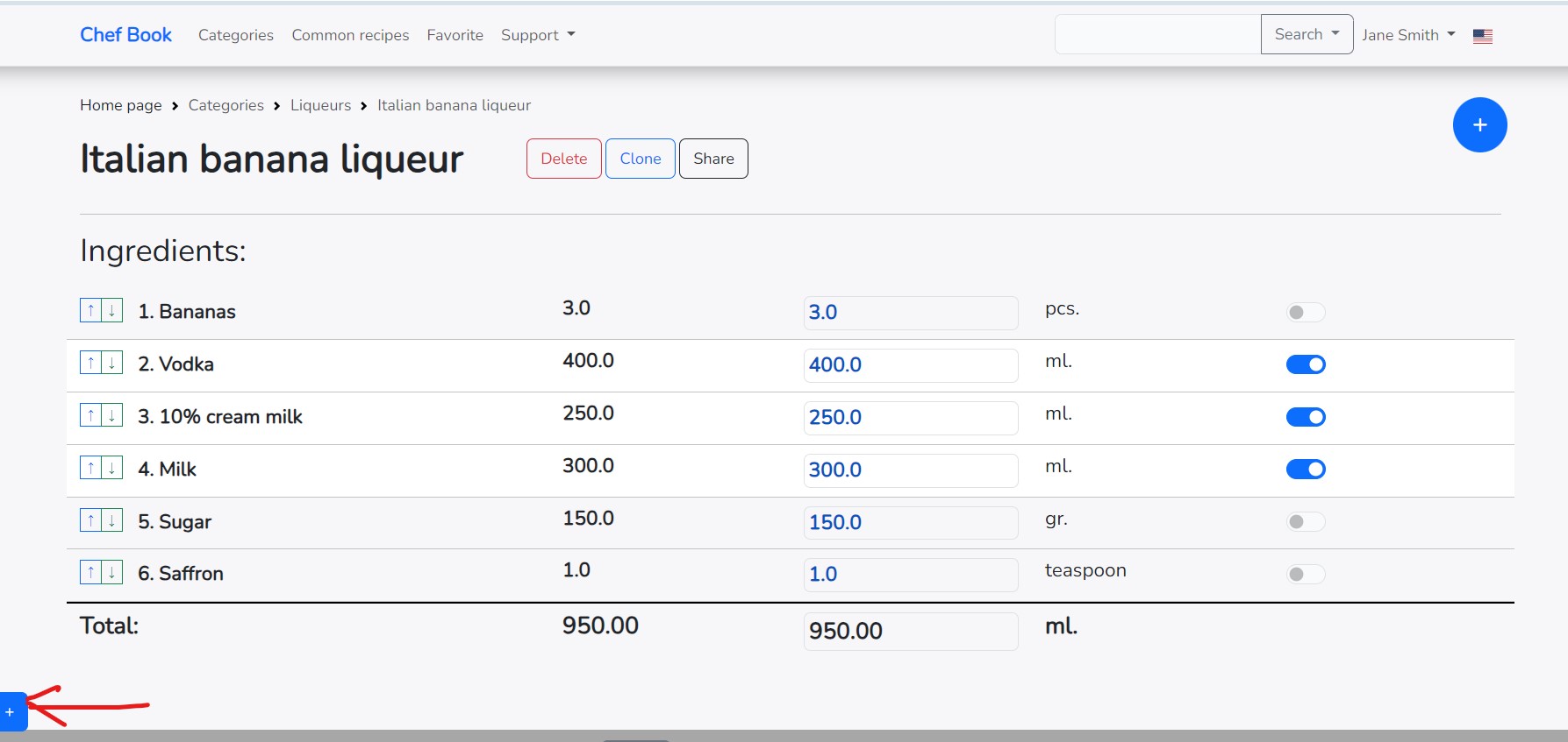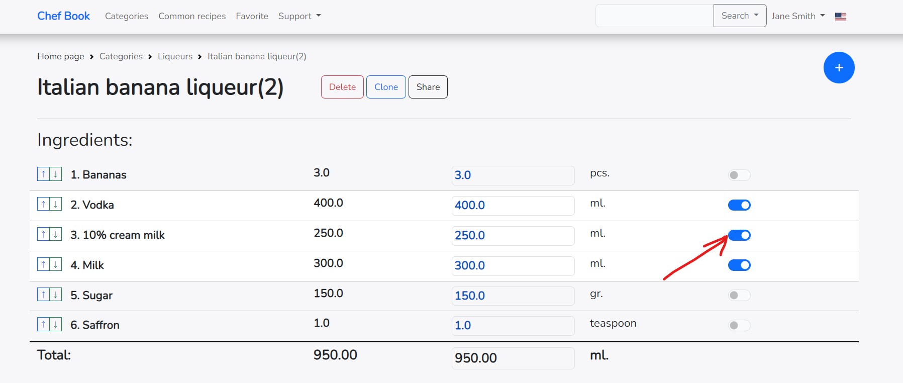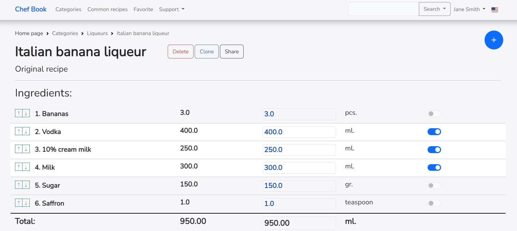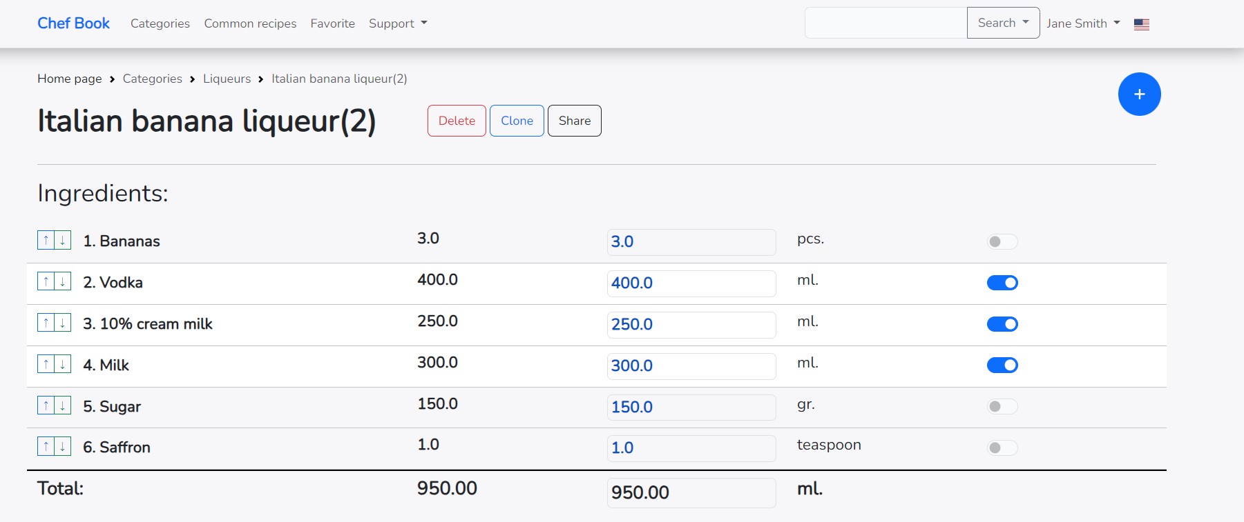 If you change the final amount of the recipe in the right column, all ingredients will also be recalculated for the entire recipe.