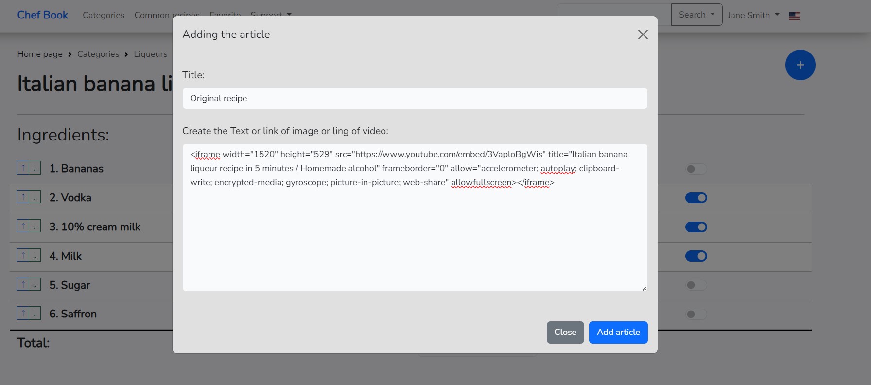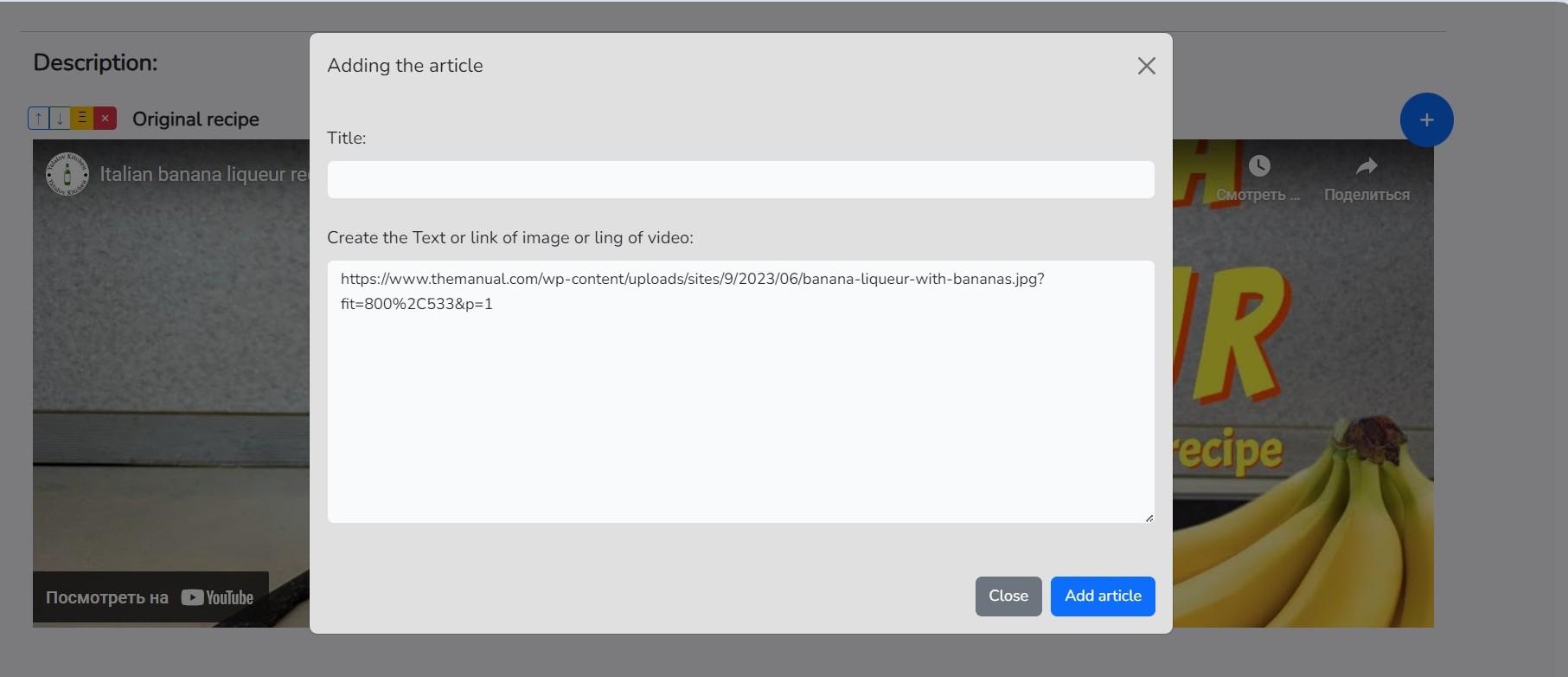 Paste the copied code into the form, as shown in the picture. If the link is copied correctly, the video will be available on the recipe page.