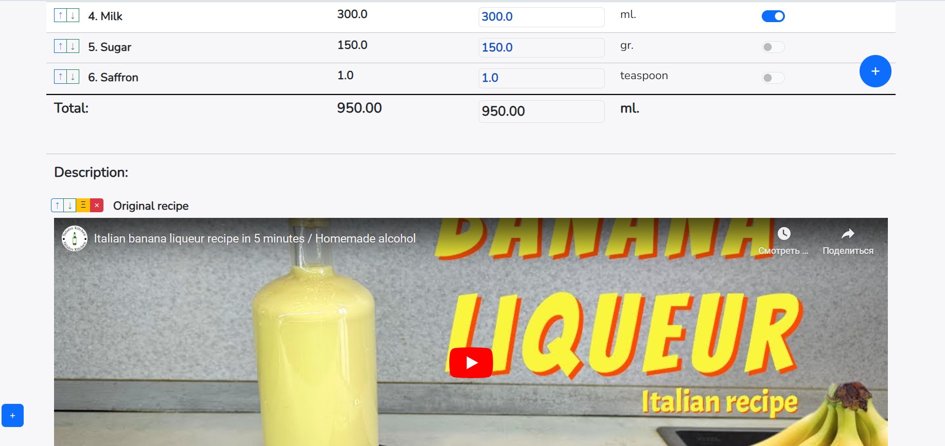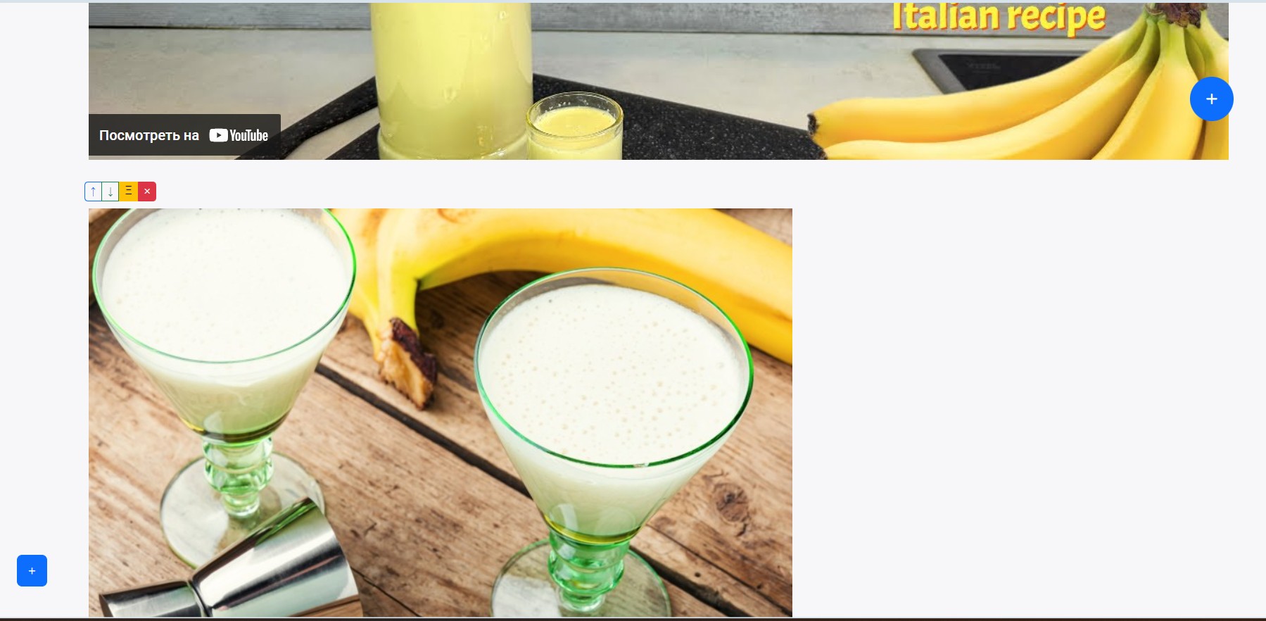 After creating a recipe, you have the option to add text for clarification or links to photos and videos on the recipe page. To open the article addition form, click on the blue square button "+" in the bottom left corner of the website.