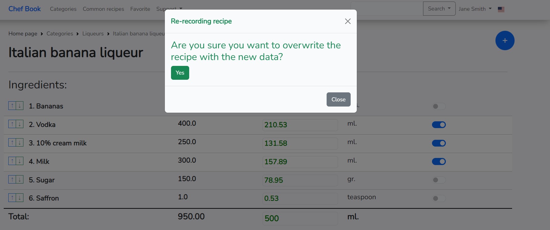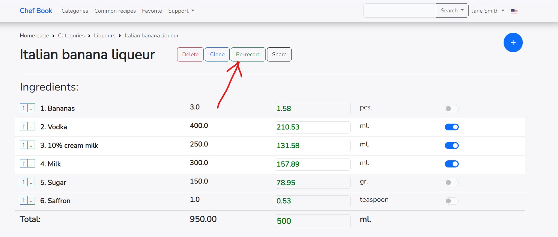 After you make changes and the application updates the quantity of ingredients, it is sometimes useful to overwrite the recipe with new data. After changing the quantity of ingredients, a green button appears to the right of the recipe name: "Re-record".
