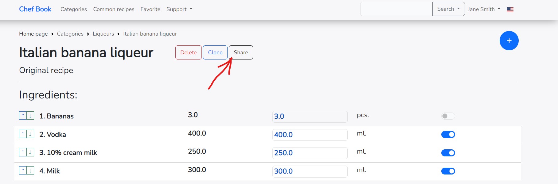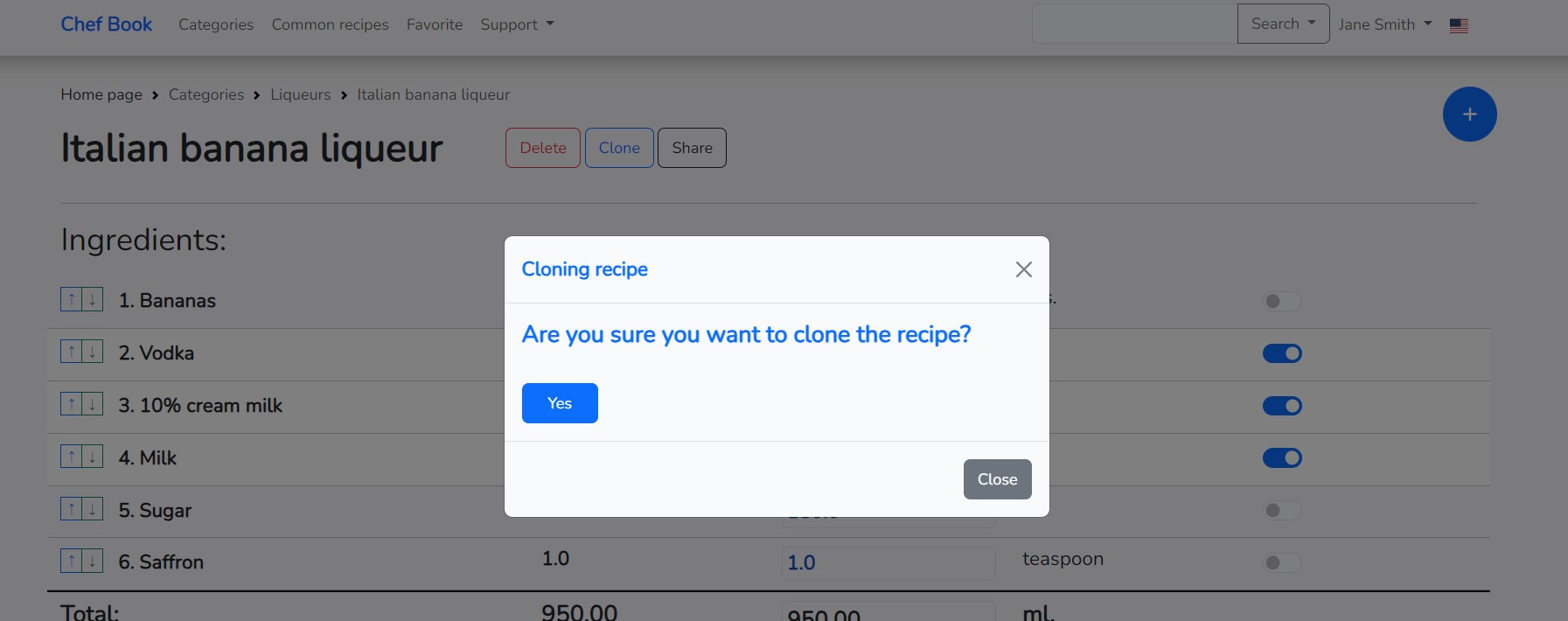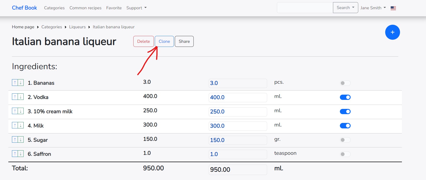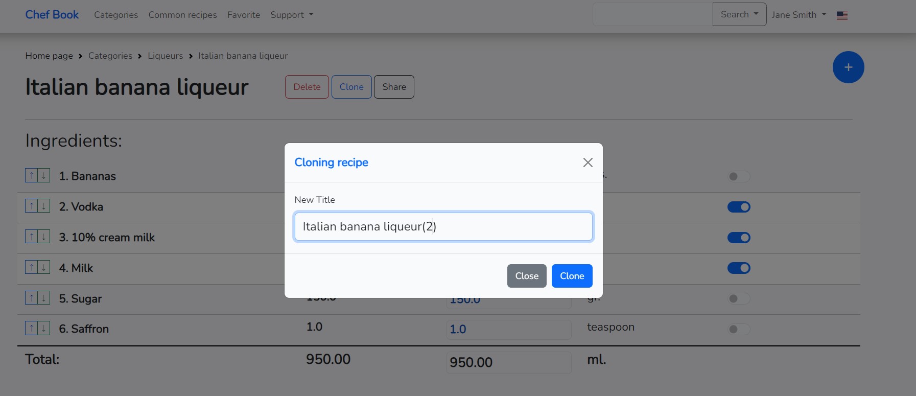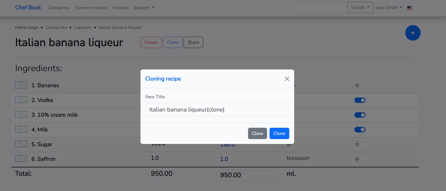 If you need to create a recipe based on an existing one, you can clone the already created recipe and make changes to it. The application has a cloning function for this purpose. To clone a recipe, click on the "Clone" button located to the right of the recipe name on the recipe page. The button becomes active only if the recipe has at least one ingredient. Click on the "Clone" button to start the recipe cloning process.