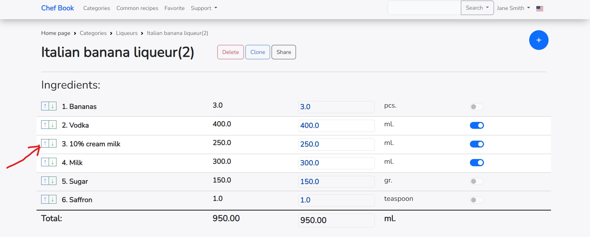 To change the order of arrangement of the ingredient in the recipe, arrows "Up" and "Down" are located to the left of each ingredient. By clicking on these arrows, you can change the order of ingredients in the recipe.