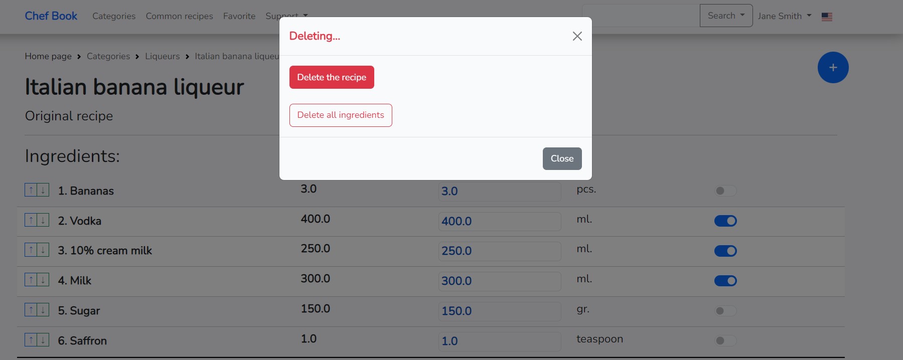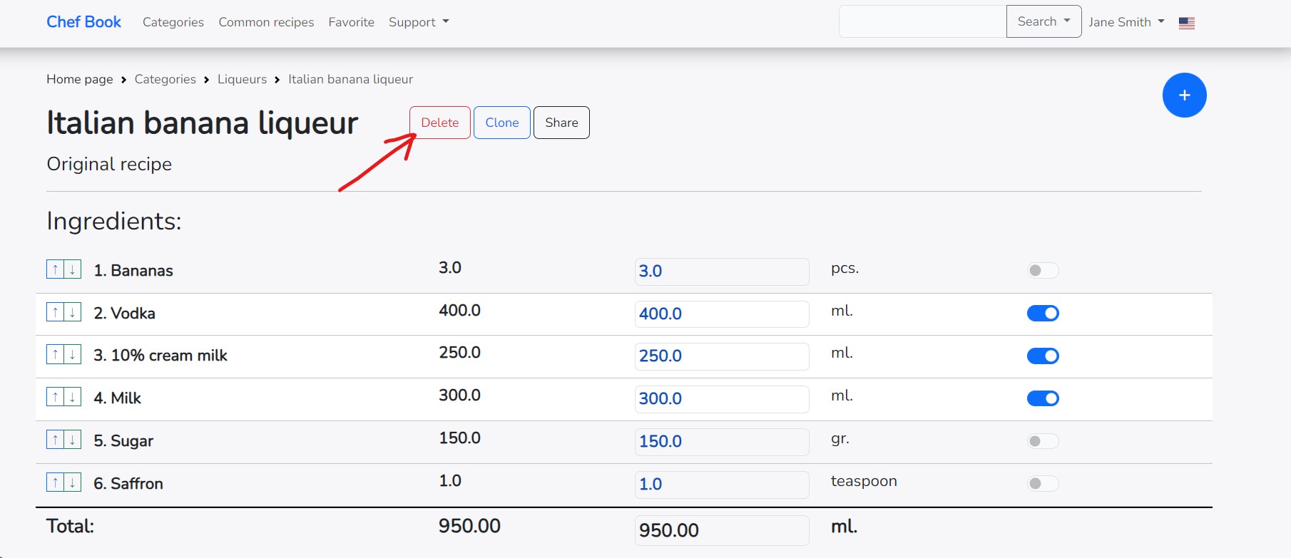 If you want to delete all ingredients at once or delete the entire recipe, click on the "Delete" button located to the right of the recipe name.